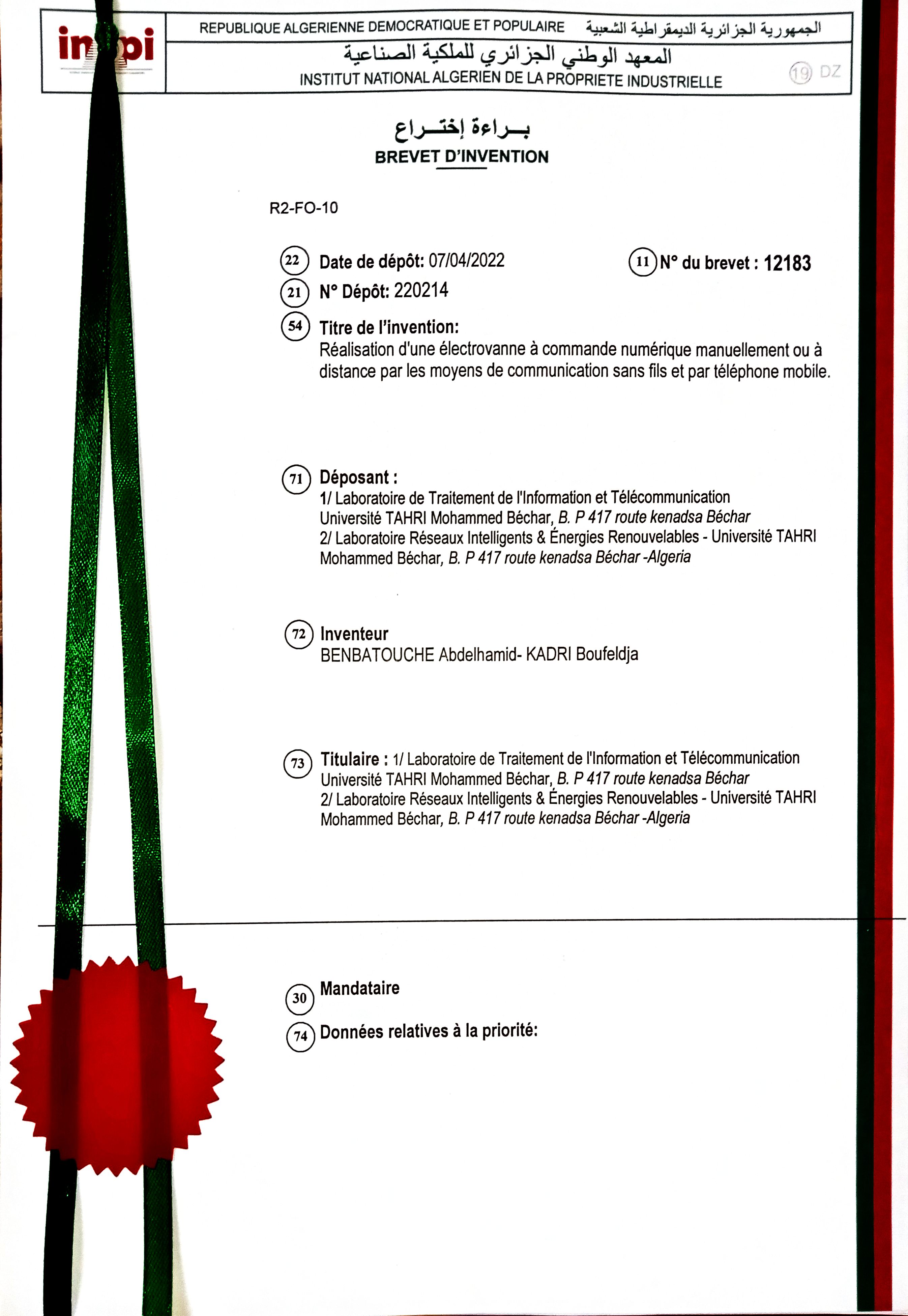 تحصلت كلية التكنولوجيا على براءة الاختراع الرابعة بفضل طالب الدكتوراة بن بطوش عبدالحميد تحت اشراف الاستاذ قادري بوفلجة التابعين لمخبري البحث : معالجة الاشارة و الاتصالات LTIT و الشبكات الذكية والطاقات المتجددة RIER.