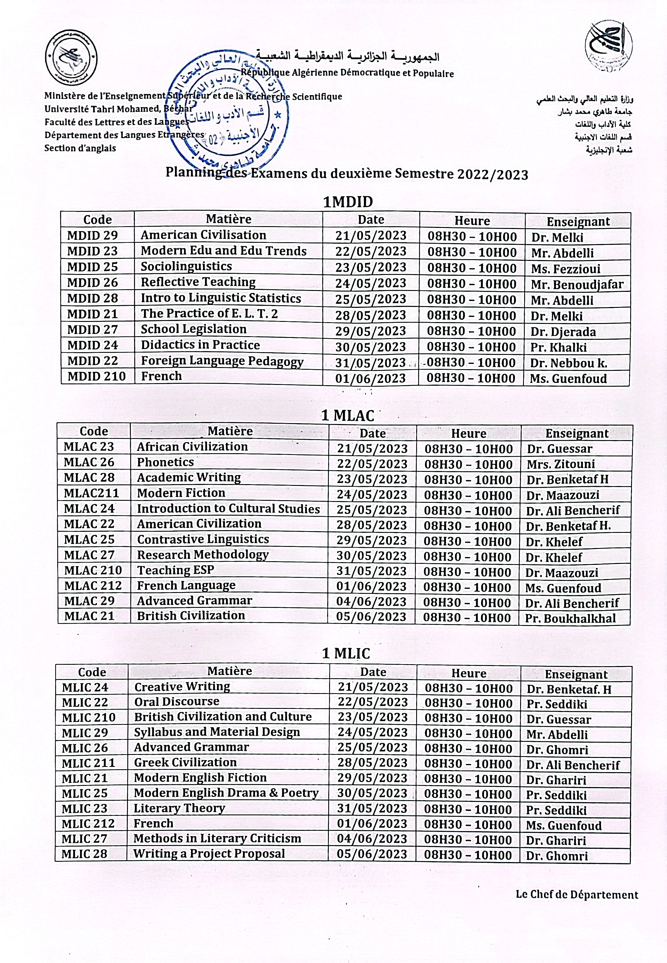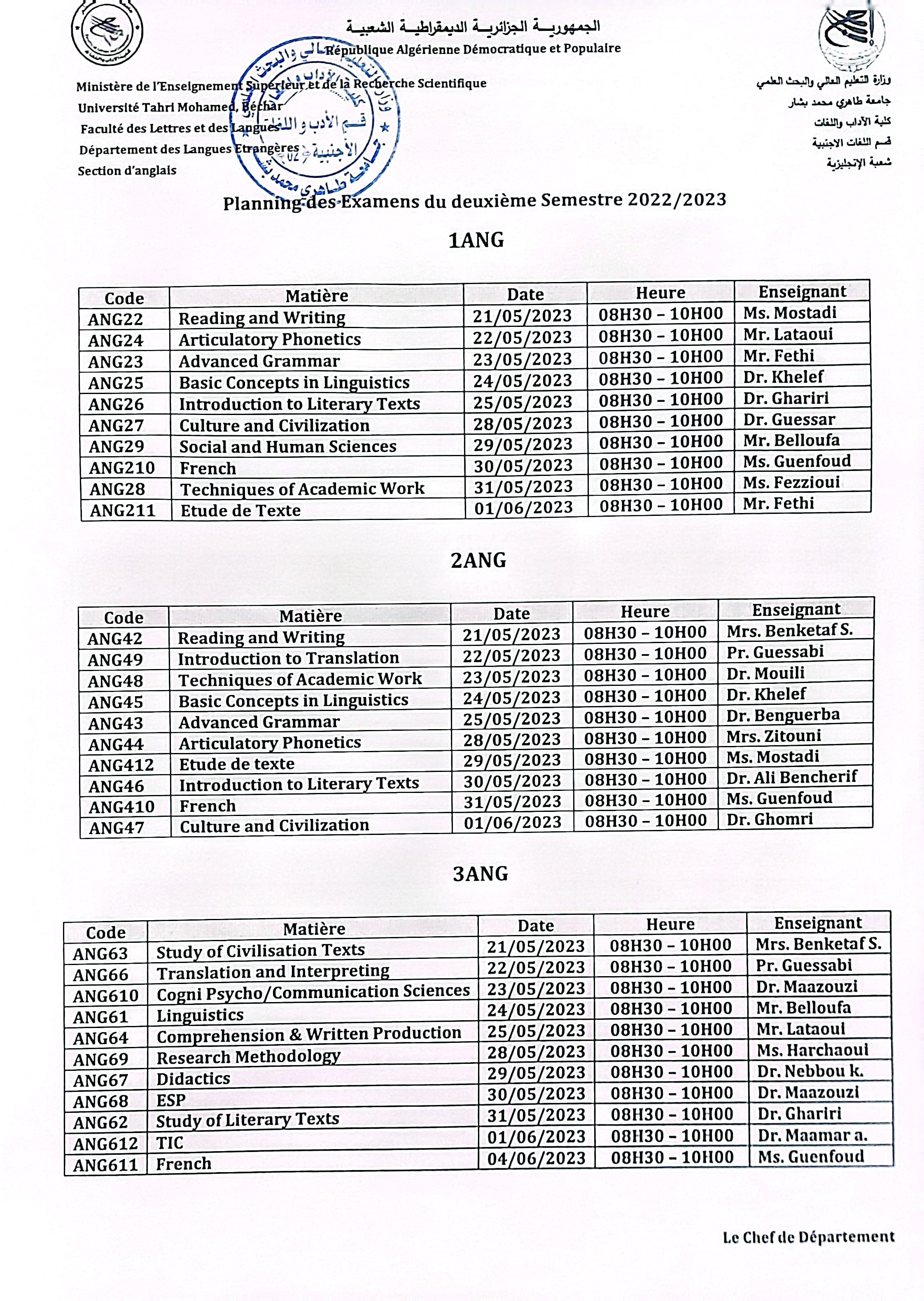 رزنامة امتحانات السداسي الثاني 2023/2022 – قسم لغة انجليزية