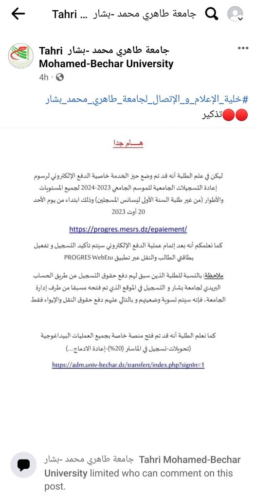 ليكن في علم جميع الطلبة أنه قد تم وضع خاصية الدفع الالكتروني لحقوق التسجيل الموسم الجامعي 2024/2023