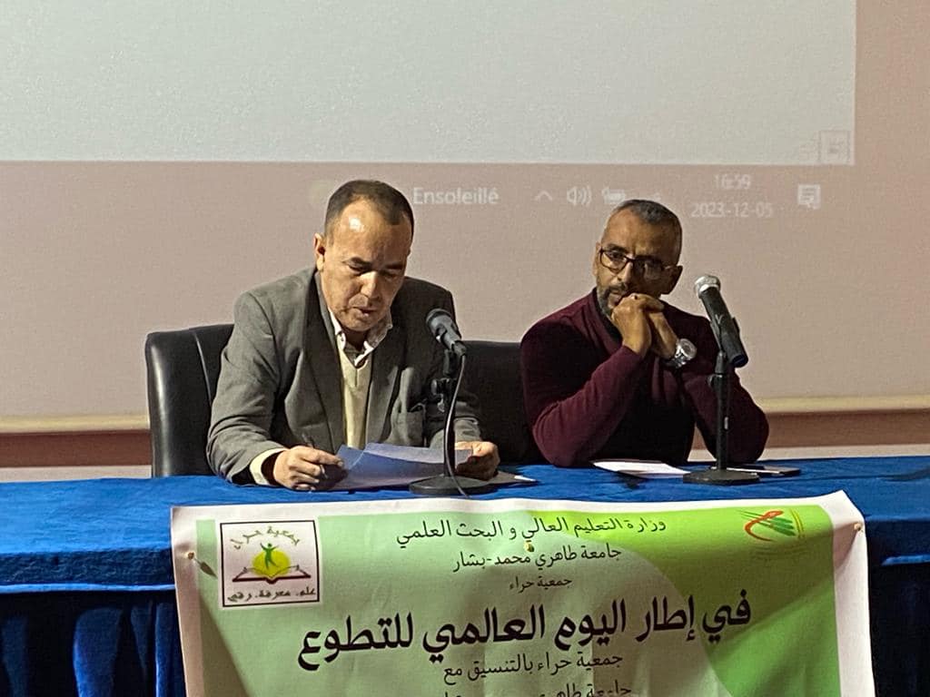 تحت الرعاية السامية للسيد والي ولاية بشار نظمت جامعة طاهري محمد – بشار بالتنسيق مع جمعية حراء يوم تحسيسي حول أهمية التطوع في الوسط الجامعي بمناسبة اليوم العالمي للتطوع بحضور الأمين العام للولاية والسلطات المحلية والمدنية وفعاليات المجتمع المدني والأسرة الجامعية ؛ حيث عرف تنظيم عديد النشاطات وهي :