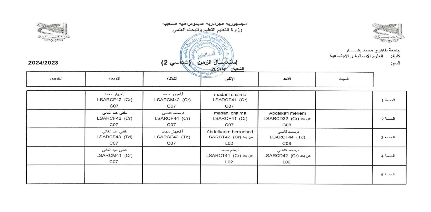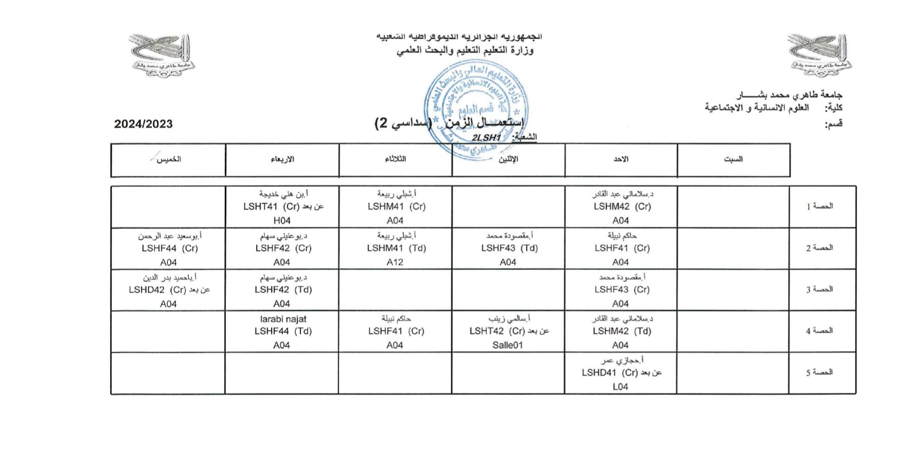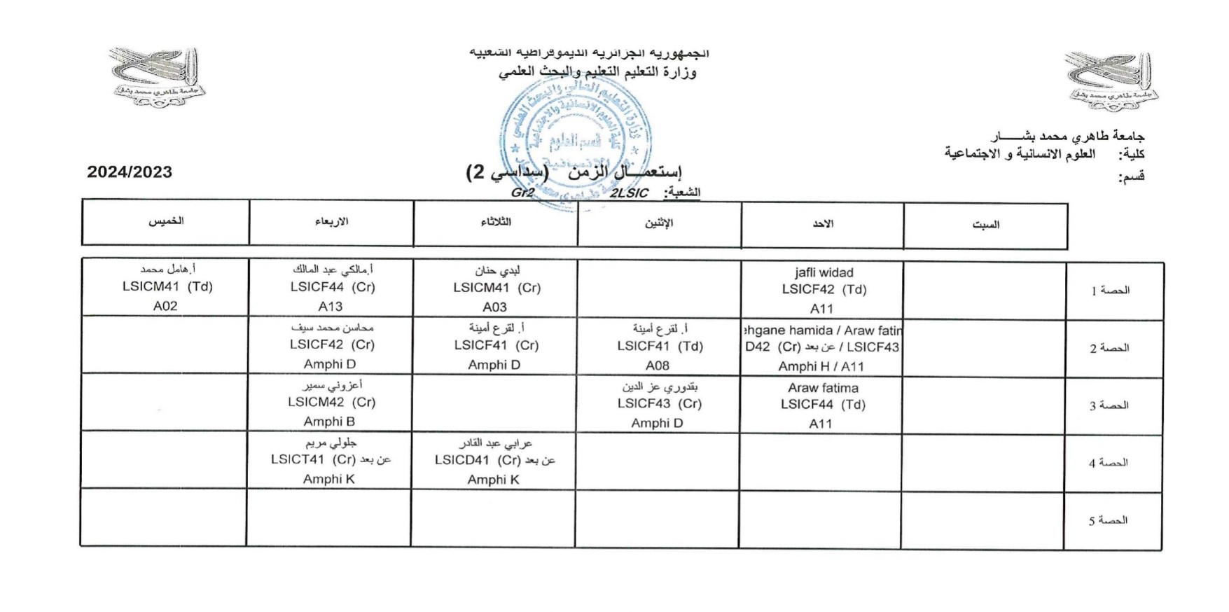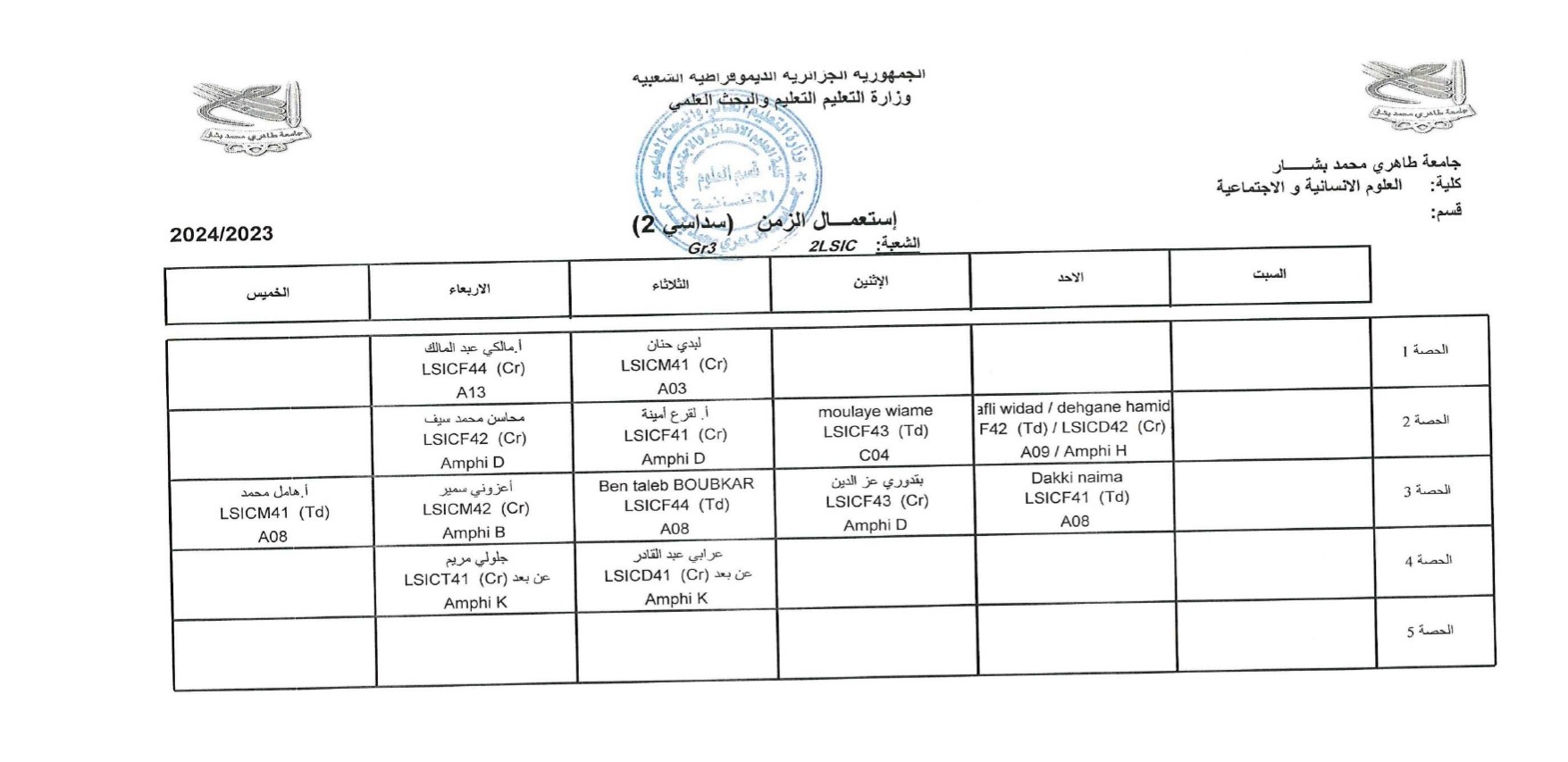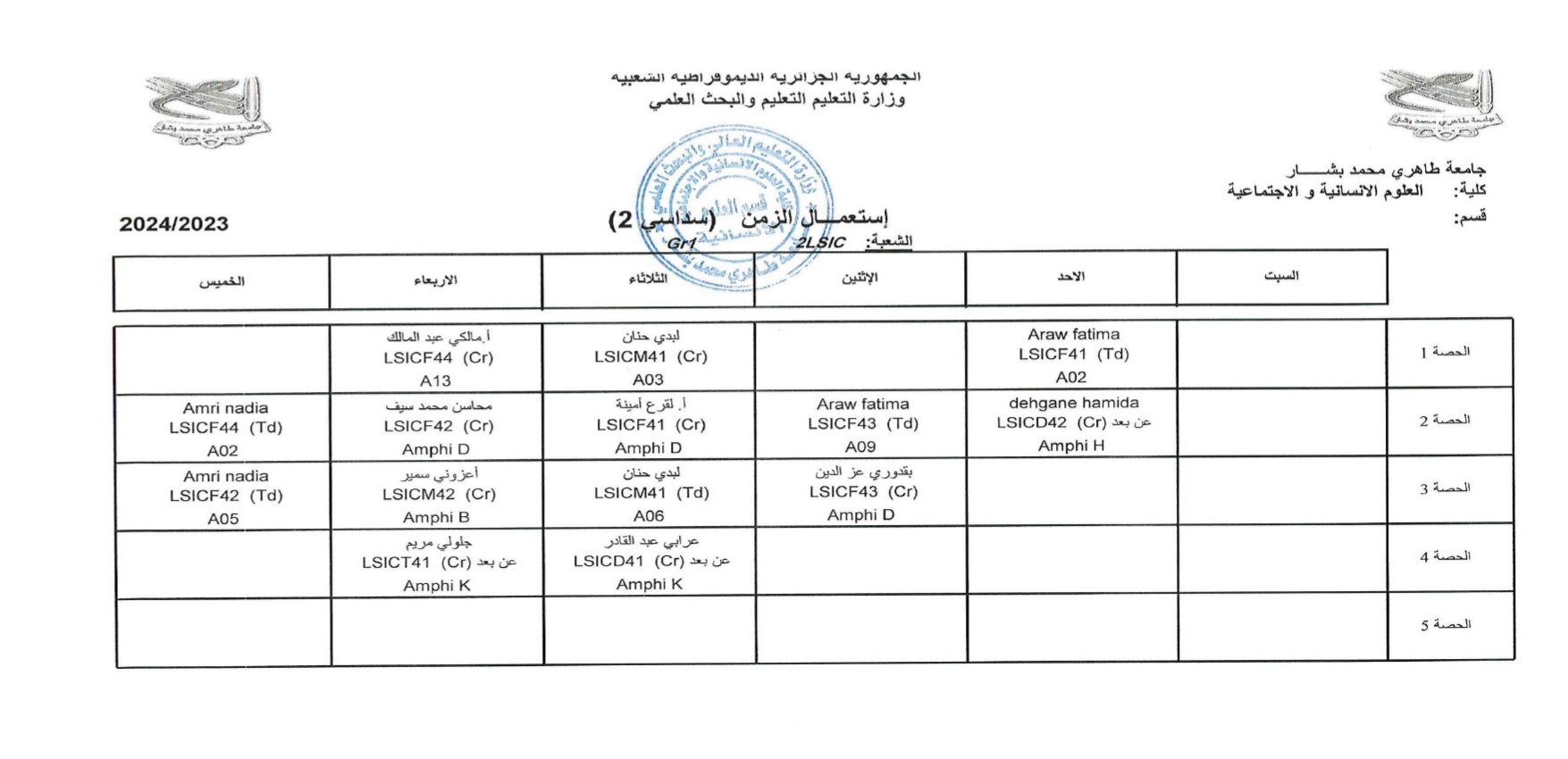 إستعمال الزمن لدفعات الثانية ليسانس 2023/2024