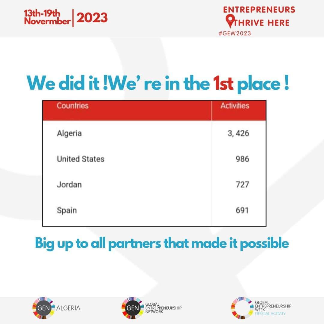 للمرّة الثانية على التوالي، #الجزائر_تحصد_المرتبة_الأولى_عالميا من حيث عدد النشاطات المقاولاتية المنظمة خلال فعاليات الأسبوع العالمي للمقاولاتية لسنة2023.