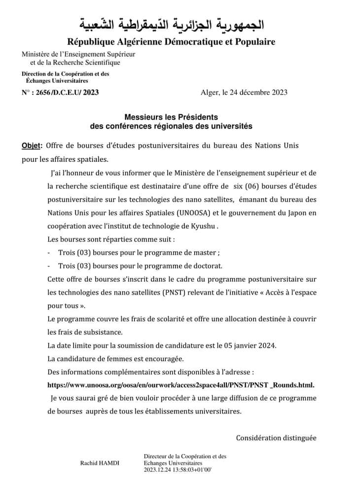 Offre d’une bourse d’études de troisième cycle du Bureau des affaires spatiales des Nations Unies.